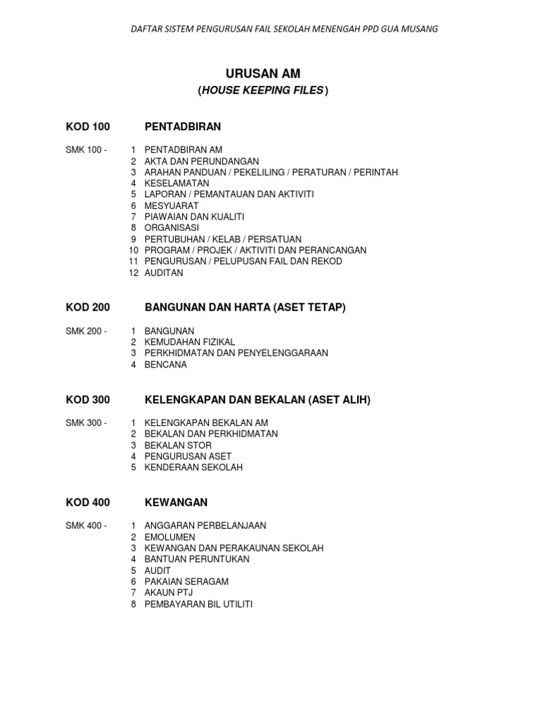 School Sekolah Menengah Kebangsaan Sultan Ahmad Tajuddin Course Title AC AUDITING Uploaded By HighnessIce8583 Pages 48. Lepas 6 bulan. Manual Klasifikasi Fail Sekolah ini disediakan dengan tujuan membantu pegawai dan kakitangan untuk memastikan pengurusan rekod dilaksanakan dengan cekap dan teratur.
